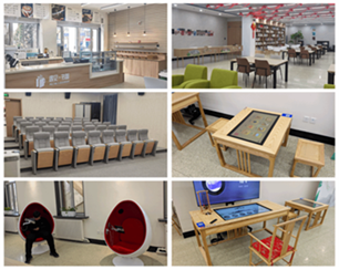 A multifunctional space integrating smart learning devices, art collections, Chinese social sciences periodicals, and a café area.