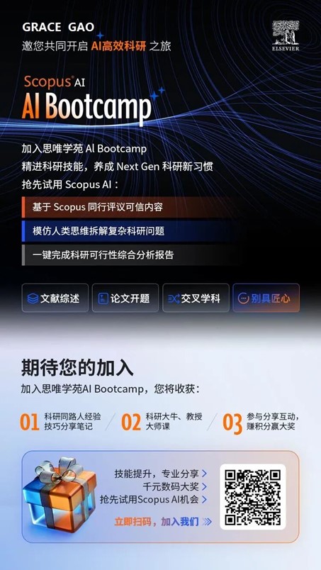 同期举办“ Scopus AI Bootcamp“ 活动,完成注册、组队、心得分享可获爱思唯尔官方奖励。