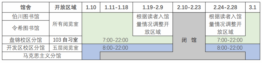 根据学校《关于2026年元旦及寒假安排的通知》,结合师生读者教学科研和学习实际需要,考虑到开发区校区分馆及盘锦校区分馆的实际,图书馆寒假期间开放安排如下: