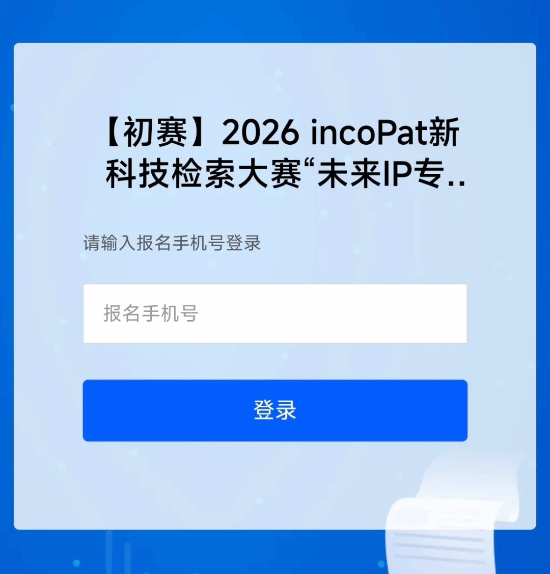 请提前在电脑端登录incoPat官网(www.incoPat.com),输入主办方提供的incoPat初赛专用账号(账号由inco26开头),在网站内进行检索解题。