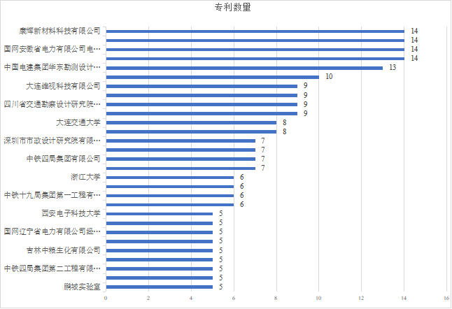 报告对2022年与大连理工大学合作进行专利申请的机构进行统计,其中合作5件及以上专利的机构及专利数量信息如图3。合作最多的机构为国家电网有限公司、国网安徽省电力有限公司电力科学研究院、山东理工大学以及康辉新材料科技有限公司,合作专利数量均为14件。