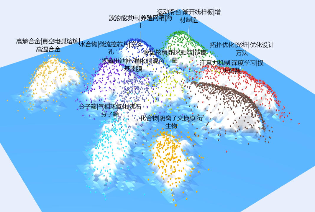 报告对2022年大连理工大学专利进行了3D专利沙盘分析,结果如图2。3D专利沙盘是专利战略分析方法,可以快速聚焦专利布局的热点。通过3D专利沙盘的聚类功能,可以形象展示专利技术竞争态势,其中,波峰代表技术密集区,波谷代表技术空白点。如图所示,大连理工大学2022年布局超过500件的技术点包括:“注意力机制/深度学习/损失函数”、“运动滑台/渐开线样板/增材制造”和“拓扑优化/光纤/优化设计方法”。另外,根据3D沙盘山峰走向可以发现大连理工大学专利布局有着较为明显的技术方向区分,且每一方向的技术布局均较为密集、波峰十分明显,呈现显著团队特征。