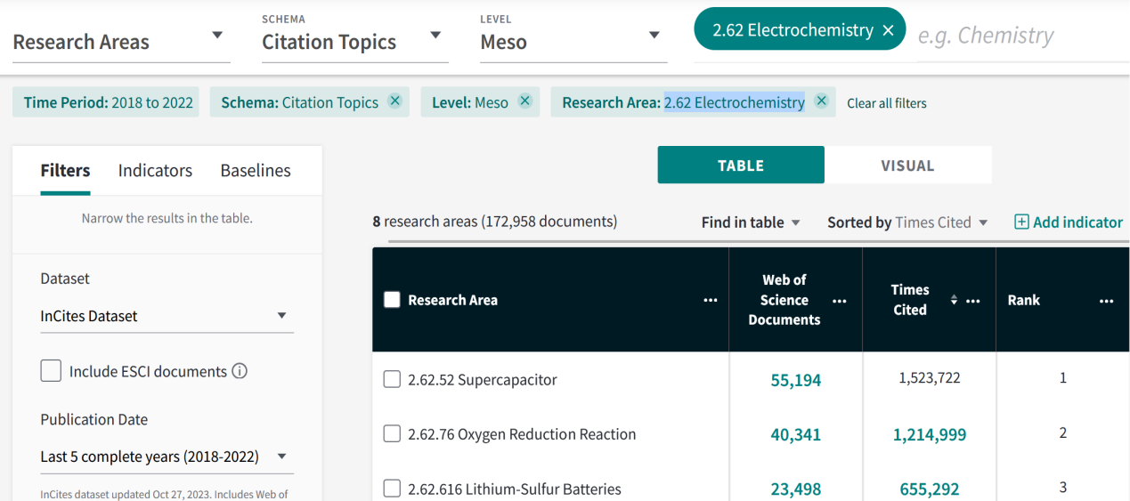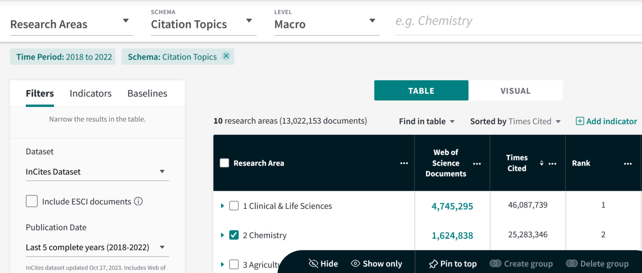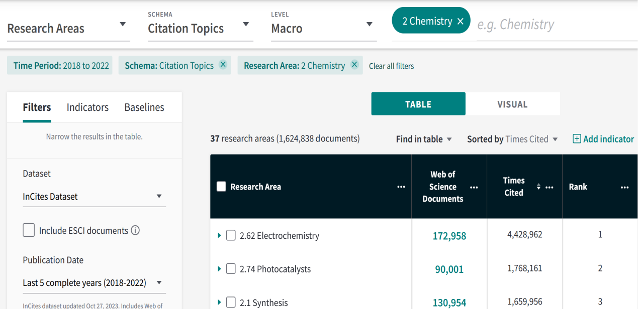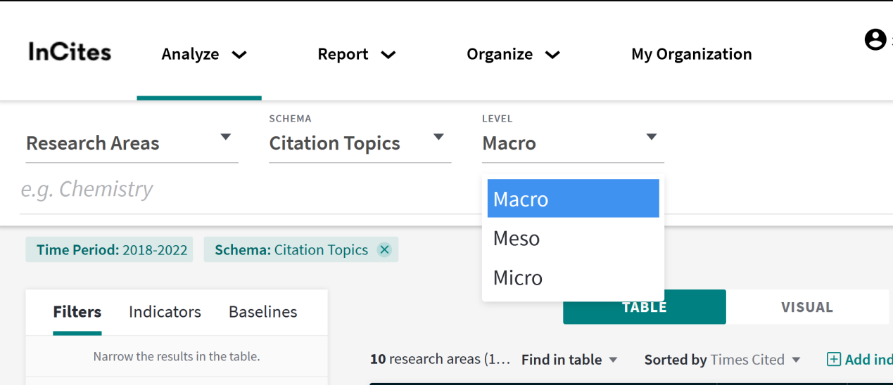 在图书馆主页-数据库-选择Incites。然后可以根据需求在以下图示筛选框选择:Research Areas-Citation Topics及主题层级(Macro、Meso、Micro三级展开),针对研究主题展开分析。