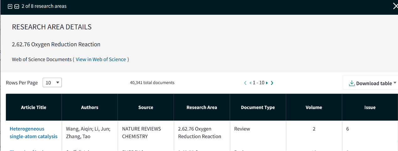 例如,如果想了解Meso-2.62.76 Oxygen Reduction Reaction主题下,发表了哪些论文?可以点击web of science documents下数字,继续点击view in web of science了解主题内论文发表情况。