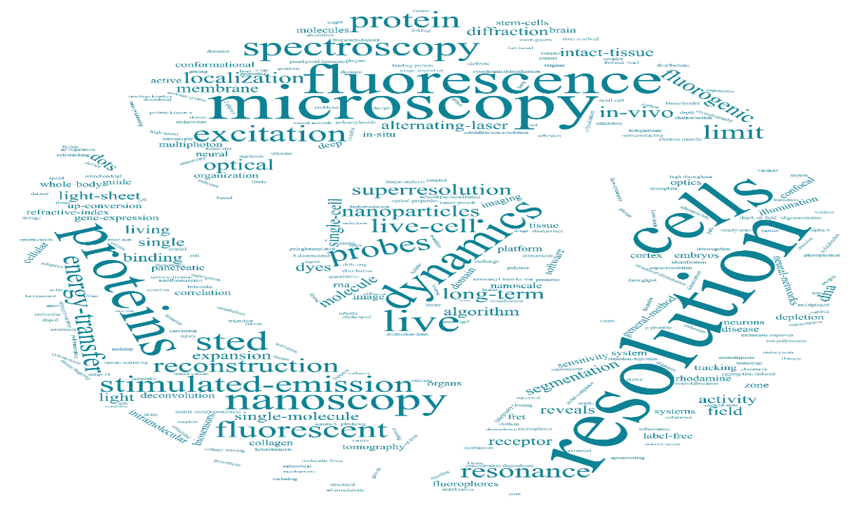 论文被引是判断论文价值的重要指标之一。citation topic-Meso-2.259 Optical Chemistry研究共有56篇高被引论文,高被引论文关键词词云图见图4。高频关键词包括:RESOLUTION、MICROSCOPY、RESONANCE ENERGY-TRANSFER、PROTEINS、DYNAMICS、STIMULATED-EMISSION、STED NANOSCOPY、FLUORESCENT PROTEINS、FLUOROGENIC PROBES、SPECTROSCOPY等。