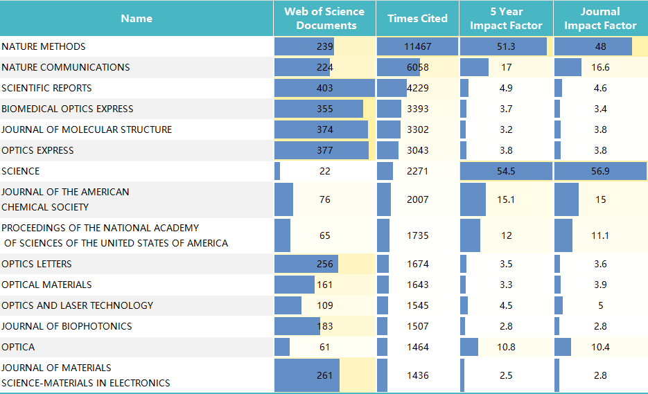 citation topic-Meso-2.259 Optical Chemistry研究共涉及2378种来源期刊,按照期刊被引频次由高到低排序TOP15如下: