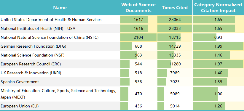 具有基金资助的项目往往是经过同行专家评议而产生的,通常认为其具有较高的学术水平,因此通过研究基金资助项目而撰写的相关论文的被引情况,也在一定程度上反映了这些基金资助项目的学术影响力。citation topic-Meso-2.259 Optical Chemistry研究发表的论文共由570个国内外基金项目资助产出,按照被引TOP10的基金项目分别为: