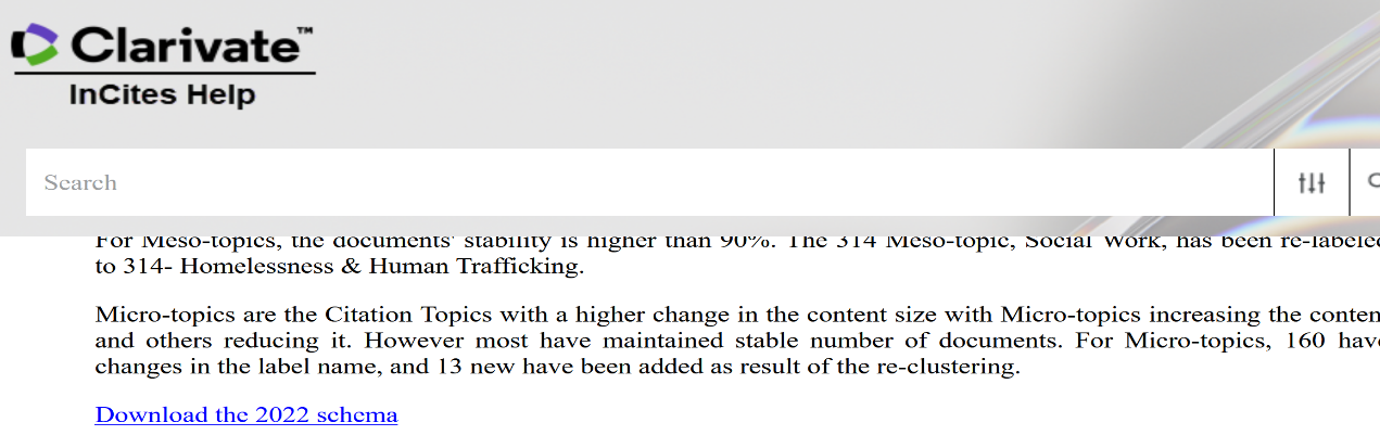 对于citation topics 主题层次结构,可以通过incites主页上Help-搜索citation topics-Download the2022 schema下载。