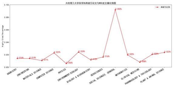 大连理工大学各学科WOS发文量及高被引论文比例: