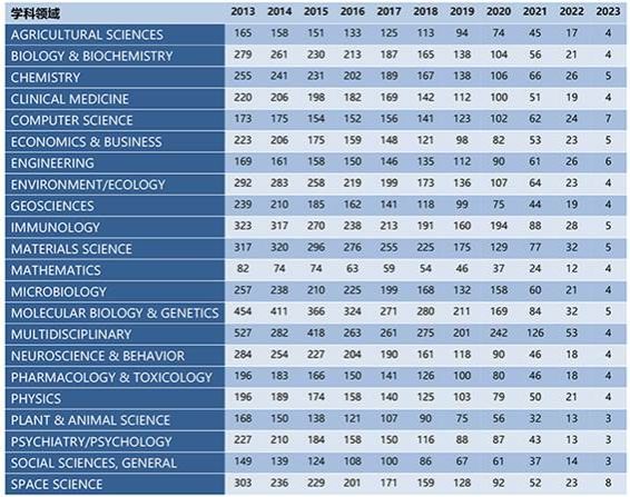 2023年11月9日,科睿唯安(Clarivate Analytics)公布了2023年11月的ESI最新数据。ESI(基本科学指标数据库)是目前世界范围内普遍用以评价高校、学术机构、国家或地区国际学术水平及影响力的重要评价指标工具之一。本次数据覆盖时间范围为2013年1月到2023年8月。
