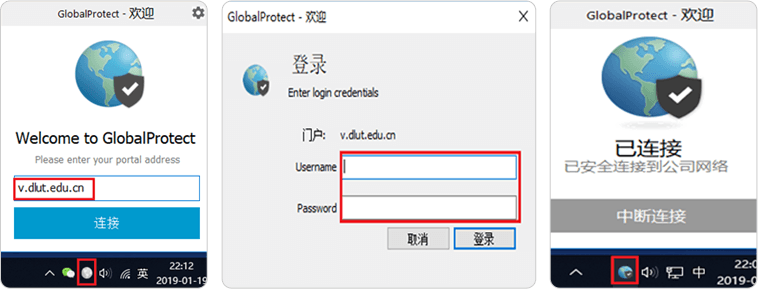 1.单击系统托盘中VPN客户端图标,首次运行需输入入口地址:v.dlut.edu.cn,并点击“连接”按钮