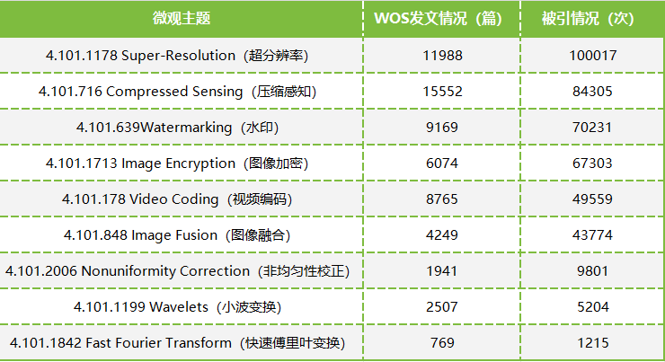 截至数据统计日期,Security, Encryption & Encoding覆盖的论文数量为61,014篇,总被引次数为431,409次,共涵盖9个微观主题,分别为:4.101.1178 Super-Resolution(超分辨率)、4.101.716 Compressed Sensing(压缩感知)、4.101.639 Watermarking(水印)、4.101.1713 Image Encryption(图像加密)、4.101.178 Video Coding(视频编码)、