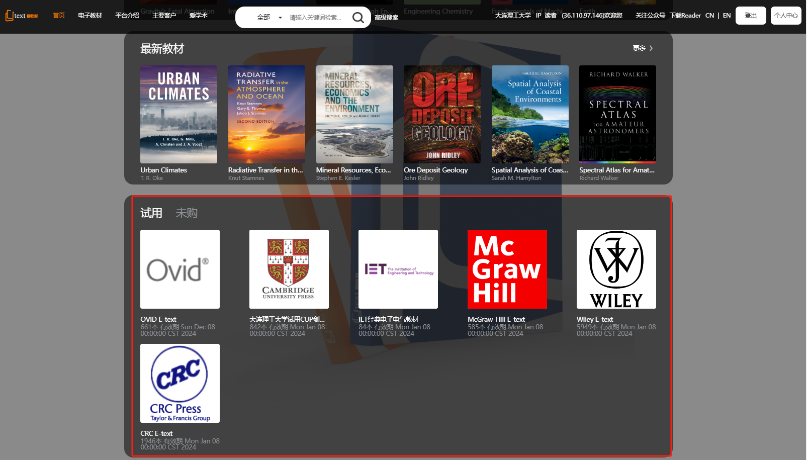学校图书馆始终致力于为广大师生提供更加权威和全面的电子图书资源。为更好地满足我校大连主校区、开发区校区、盘锦校区等三个校区广大师生对外文电子教材的文献需求,图书馆现联合爱教材(itext)平台为我校师生读者开通试用,限时免费阅读!
