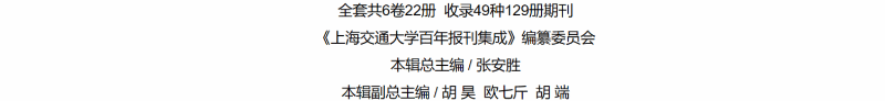 《上海交通大学百年报刊集成》将分批整理、影印出版上海交通大学1896—1996年间发行的报纸、期刊资源,是大型史料丛书,列入上海交通大学“双一流”大学文化建设专项资助。由上海交通大学档案文博管理中心组织整理编纂,上海交通大学出版社出版。首批整理出版的“学术学科类”丛刊是1949年前交通大学学术期刊的首次集成与影印出版,共计22分册,荟萃了49种129册期刊,近两千万字的宏大体量,依照学科属性,分为6卷:《综合卷》《工程卷》《理学卷》《经管卷》《研究所专刊卷》《国文卷》,并全部建成可供检索和全文阅览的电子数据库。