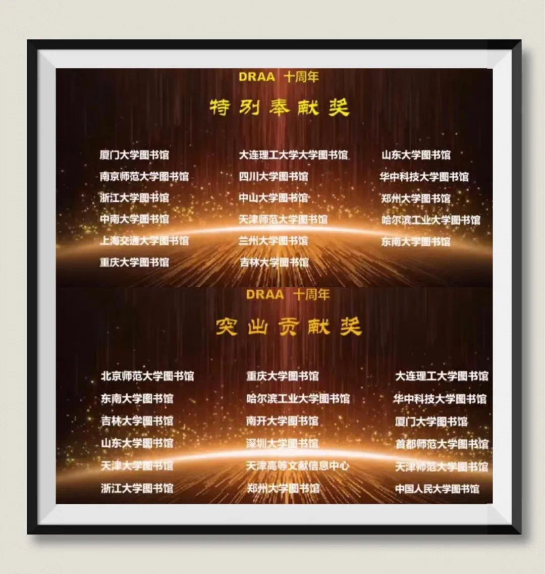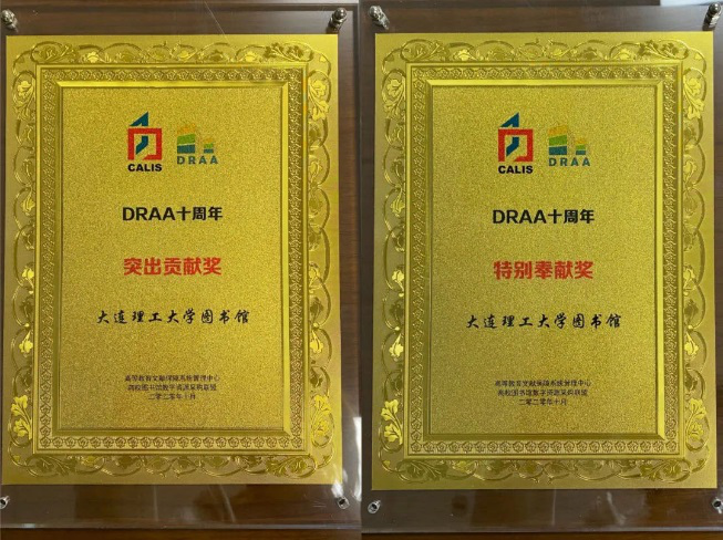 10月13日,在DRAA成立十周年庆典开幕式上,DRAA理事会对为DRAA集团采购做出杰出贡献、创新服务做出突出贡献、培训周活动特别奉献进行了表彰,其中大连理工大学图书馆荣获两项重量级表彰分别为:“DRAA十周年突出贡献奖”和“DRAA十周年特别奉献奖”。