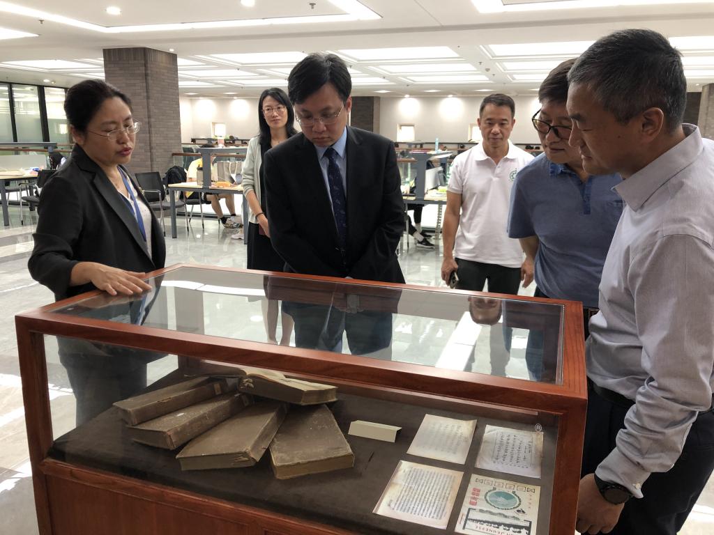 严校长一行参观三楼陈列的中文期刊回溯成果展之《新青年》杂志