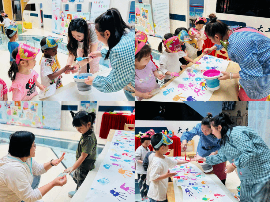 活动的第一项内容是小朋友们用色彩斑斓的颜料在手上涂抹后,将手印盖在长画卷上。孩子们的笑脸在五彩缤纷的颜料中绽放,他们兴奋地在画卷上留下自己独特的手印,记录成长印记。