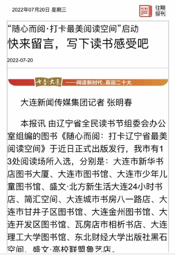 为推动全民阅读、共建书香大连,市新闻出版局联合市公共文化服务中心、大连文化产业集团,特别推出“随心而阅 打卡最美阅读空间”活动,让更多读者走进城市最美阅读空间,感受阅读的美好,促进身心的健康。