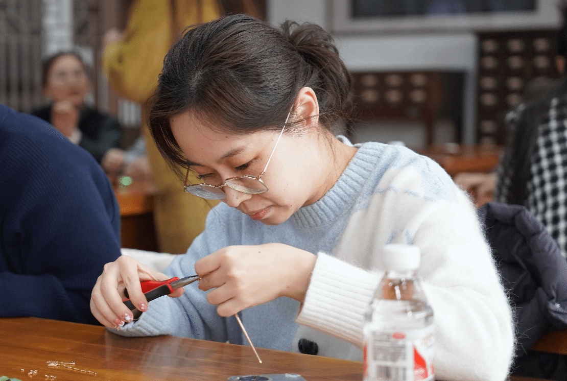 此外,图书馆联合旅顺博物馆开展了妇女节“髻簪芳华”手作竹节发簪互动体验活动,邀请专业馆员对旅顺博物馆馆藏发饰、手镯、项链等作详细介绍,带领女性教职工亲手制作竹节发簪,在珠花簪钗之间体验传统女性头饰文化之雅韵。