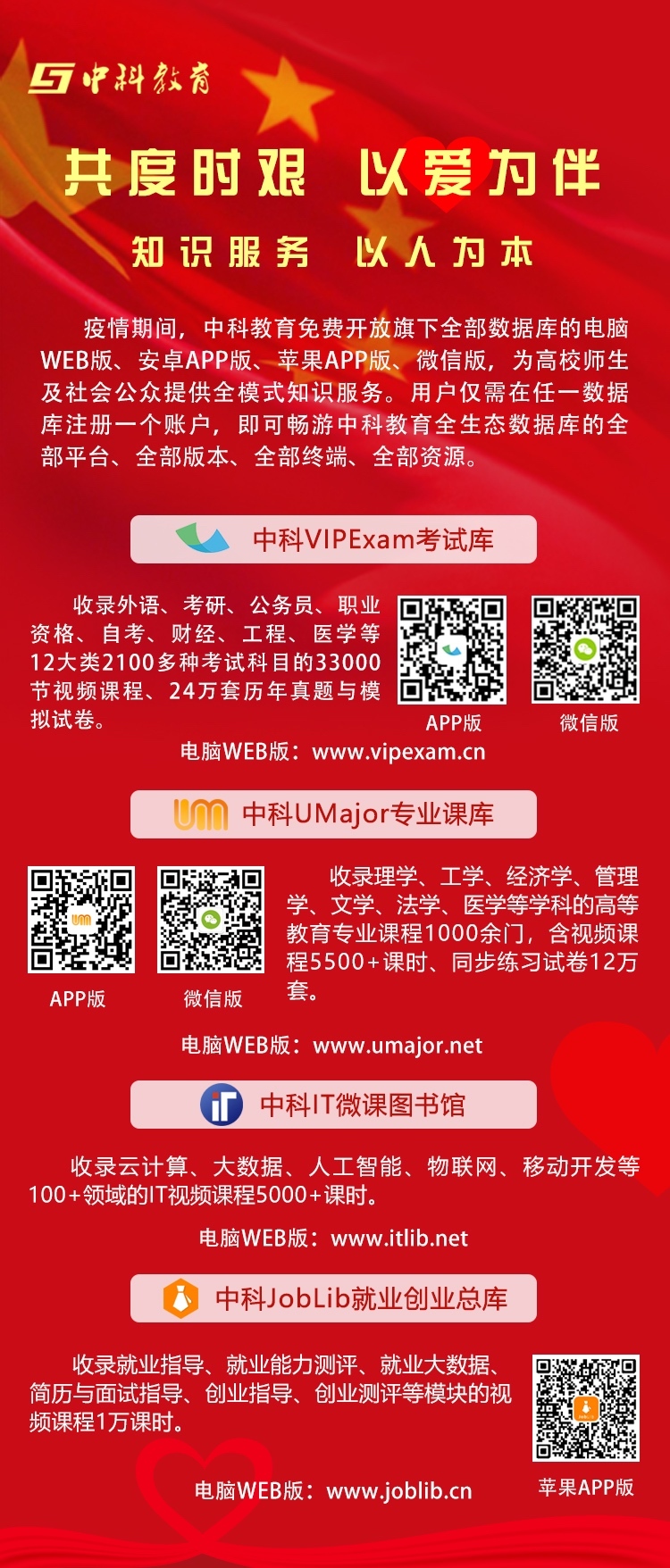 中科教育决定面向全国用户免费开放旗下全部数据库的电脑WEB版、安卓APP版、苹果APP版、微信版,为高校师生及社会公众提供全模式知识服务。用户仅需在任一数据库注册一个账户,即可畅游中科教育全生态数据库的全部平台、全部版本、全部终端、全部资源。