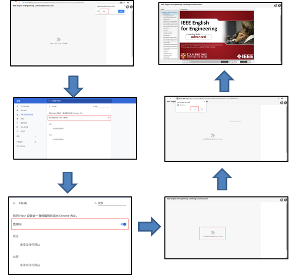 如果遇到浏览器拦截flash运行,需要完成如下设置,然后再次刷新即可观看课程。