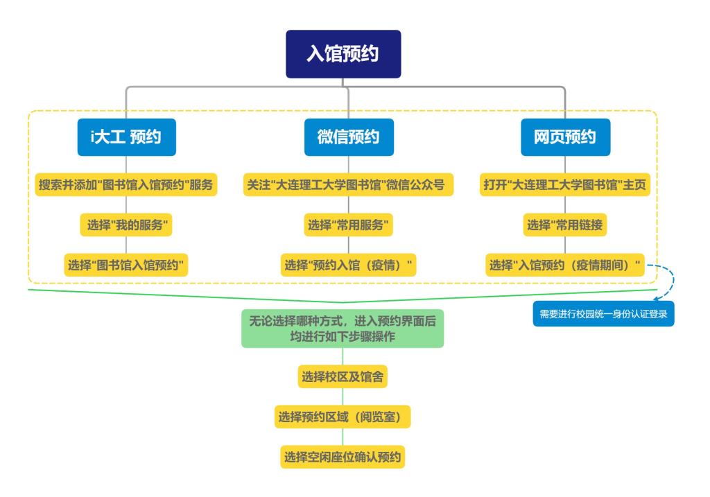 根据疫情防控要求,大连理工大学图书馆拟于2020年秋季开学后开馆,自开馆之日起拟在伯川图书馆、令希图书馆、开发区校区图书馆、盘锦校区图书馆试运行“大连理工大学图书馆入馆预约系统”,入馆读者须在系统中预约选取座位方能入馆,限流入馆。