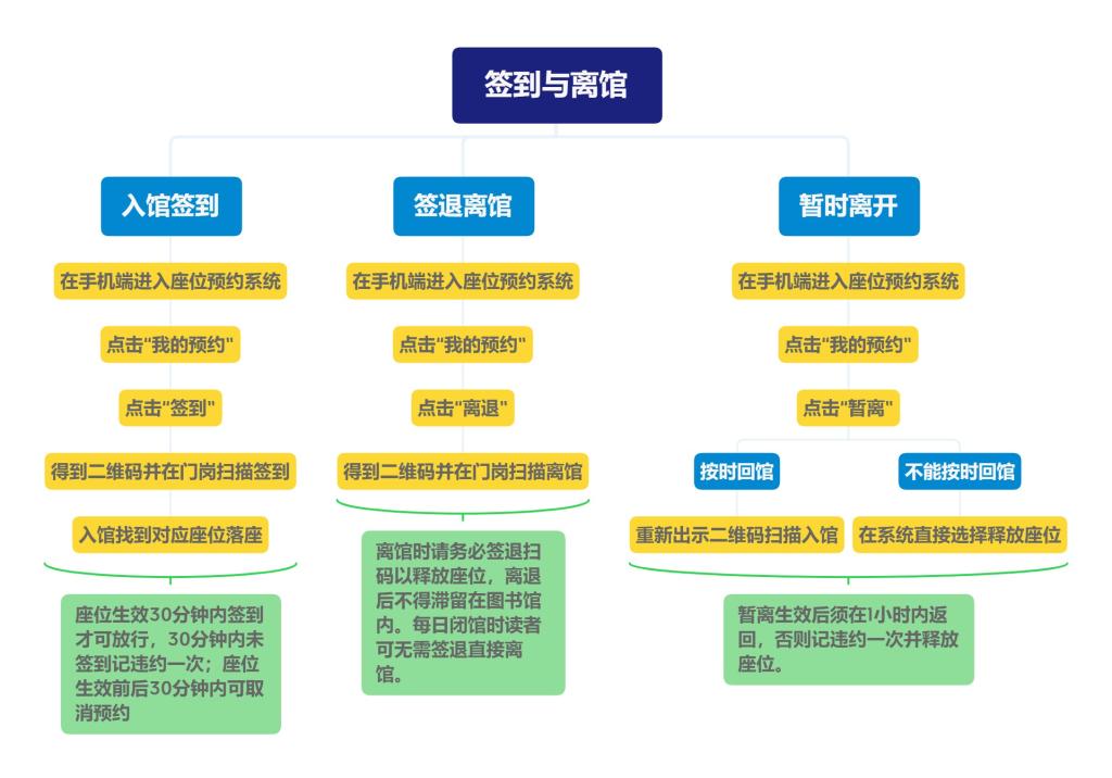 3.入馆落座。阅览的读者进入图书馆后需按预约的位置尽快落座,不得随意更换座位。选择“疫情期间快速随机分配“预约入馆的读者,在办理完业务后可离馆。