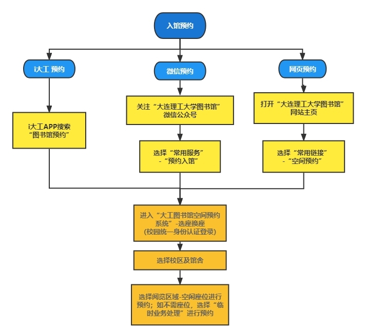 “i大工”APP搜索“图书馆预约”服务进行预约。