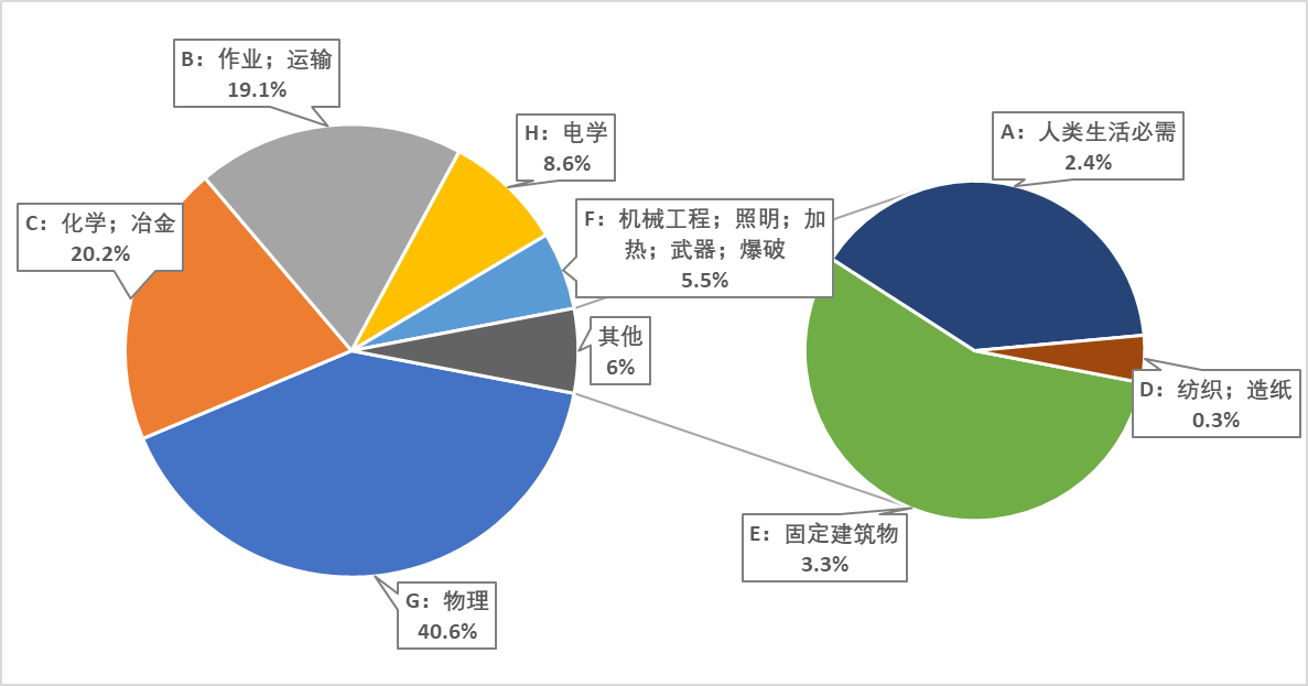 报告对大连理工大学2022年专利技术布局状况进行分析,结果如图1所示,图中利用颜色标识IPC分类,用扇形面积标识专利数量。根据图中信息,2022年大连理工大学专利主要布局在G部(物理,40.6%)、C部(化学;冶金,20.2%)、B部(作业;运输,19.1%)、和H部(电学,8.6%)。