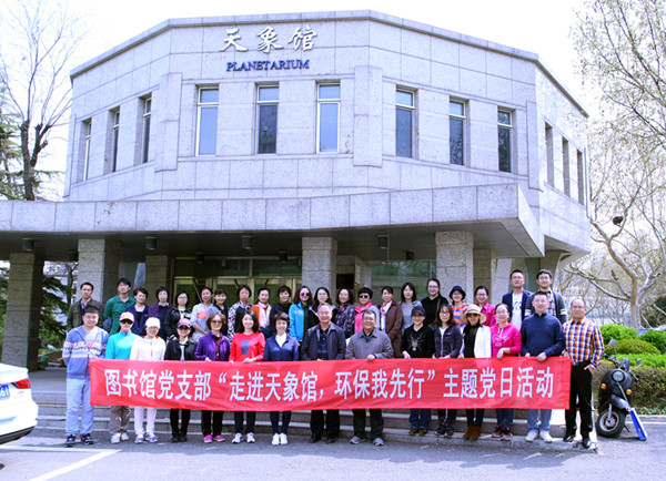 为贯彻执行党的十八大精神,引导党员为建设生态文明社会贡献自己的一份力量;同时, 在4月22日“世界地球日”到来之际,为宣传环保理念,唤起党员群众爱护地球、保护家园的意识,让环保意识深入人心,图书馆党支部组织全体党员开展了“走进天象馆,环保我先行”主题党日活动。四月的大连,春暖花开,和风习习。27日中午,支部43名党员会聚到伯川馆南门,共同参与到活动中。