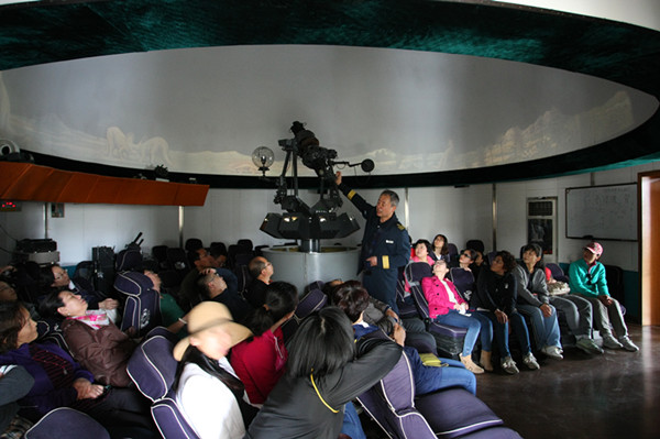 接下来,刘伟环馆长带领全体党员参观了大连海事大学天象馆。大连海事大学天象馆是大连的一个爱国主义教育基地,是航海实验室的组成部分,主要承担《航海学》课程中天文航海部分的实验教学。天象仪能够演示6000颗恒星和主要行星。具有赤道和地平两套天文坐标系统,能同时做恒星周日、太阳周年、北极星岁差南北及星空变换等多个方向的视运动,这些功能极大地方便了复杂抽象的航海天文理论课教学。刘老师为党员们详细演示了日月星辰春夏秋冬运行的规律,介绍了各种星座的位置、黄道赤道的轨迹、如何利用天象导航、如何根据天象为生活服务……为图书馆全体党员上了一堂生动的天文课。