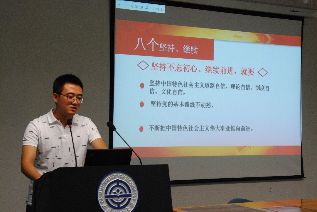 支部党员麻海博从“关于历史经验的总结和历史规律的阐释”、“‘不忘初心,继续前行’的八个方面的时代课题”和“‘进京赶考’”的警示和自觉”三个角度与与会党员一起回顾学习了习近平总书记在庆祝中国共产党成立95周年大会上的重要讲话精神。通过学习,大家纷纷表示,要认真学习好、领悟好、贯彻好讲话精神,要按照习近平总书记的讲话要求,保持艰苦、奋斗的作风,勇于创新,永不停滞,将“不忘初心,继续前进”内化于心,外化于行,在今后的学习、工作和生活中贯彻落实。