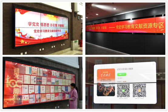 在伯川馆二楼大厅和二楼会议区,利用2个大型瀑布流电子阅读屏,专题设置了党史学习教育文献资源专区。精选的3000种优质图书、300种期刊、50种党报、500集视频,缓缓从大屏划过,轻触屏幕书刊封面,可在线阅读,可扫码下载,轻松快捷。党史文献资源的现代化呈现和数字化阅读,将极大丰富读者的阅读体验,提升学习的时效性和便捷性。
