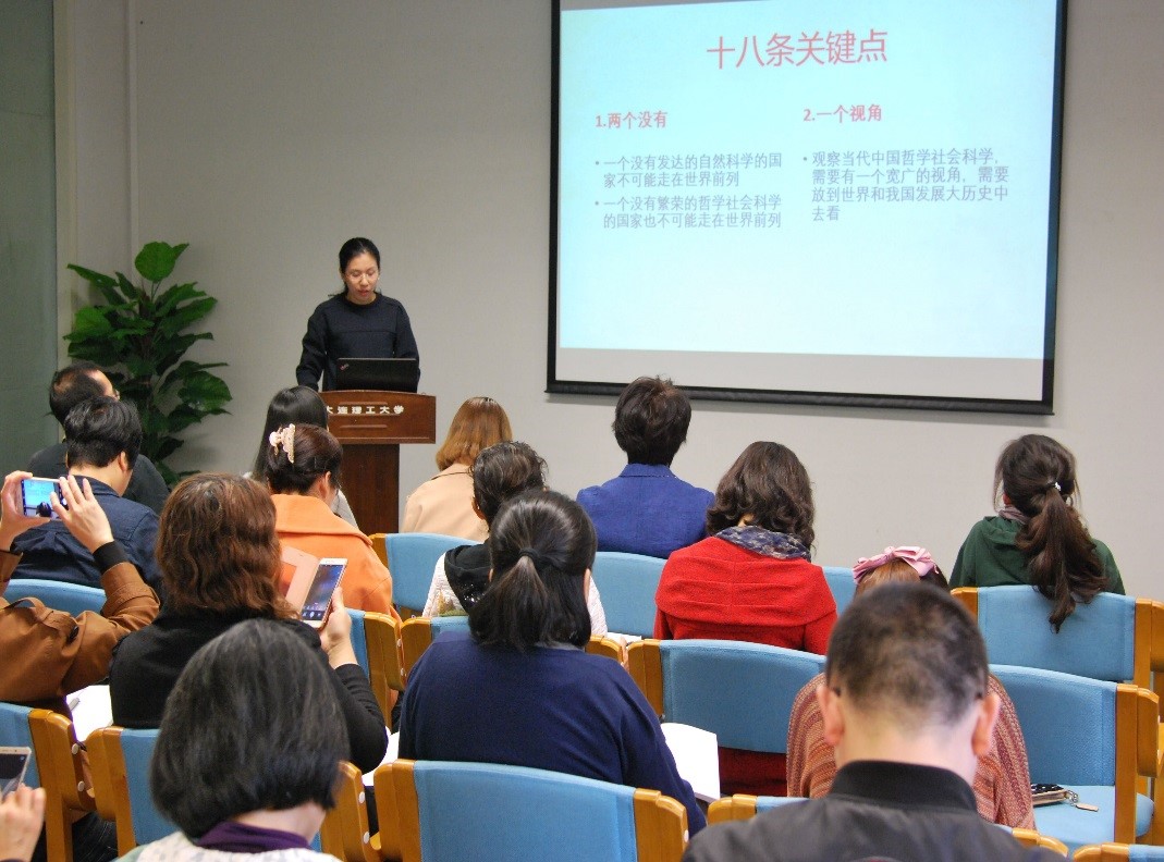 接下来,由徐磊同志带领大家共同学习了习近平总书记在工作座谈会上的讲话。她整理并分享了讲话内容的十八个关键点,从“一个视角”、“两个最为”、“三个不断”等角度带领党员们深入学习了习近平总书记讲话精神,并详细阐述了构建中国特色,既要体现继承性、民族性,又要体现原创性、时代性,更要体现系统性、专业性等讲话的重要内容。最后,徐磊同志以习近平总书记在座谈会上的一段话激励全体党员同志“以自己的智慧和努力,为实现‘两个一百年’奋斗目标、实现中华民族伟大复兴的中国梦不断做出新的更大的贡献”。