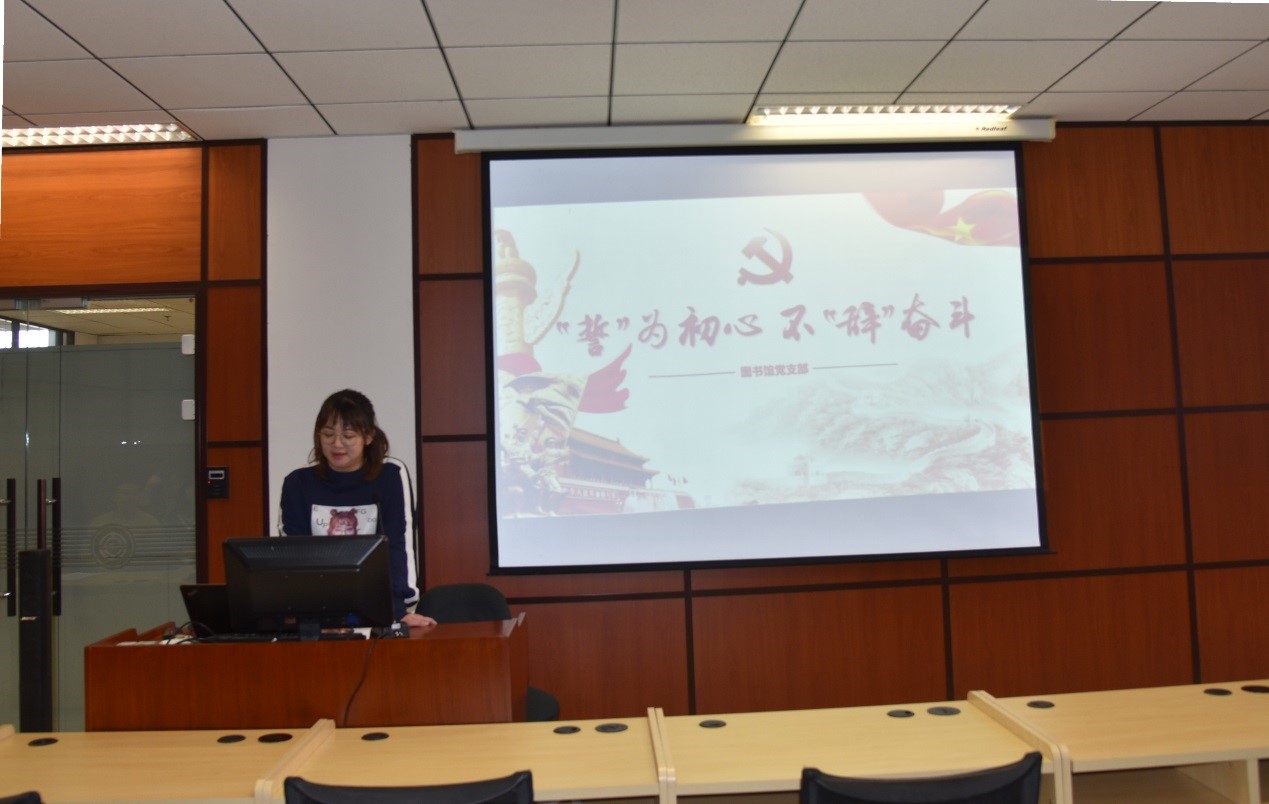 围绕“不忘初心”这个主题,图书馆党支部全面梳理、精心准备,最终选取了入党誓词作为切入点,以誓词的演变为主线,图书馆党支部党员刘姝瑾同志为主讲人,以“‘誓’为初心 不‘辞’奋斗”为主题,开展了一场意义深刻的初心教育。让广大党员更好地了解各历史时期入党誓词演变及核心,牢记践行入党誓词是不忘初心的基本要求。主题党日全面学习、分析、对比了建党初期、抗日战争时期、解放战争时期、新中国成立初期、改革开放新时期五个时期入党誓词的变化,领悟了不同历史时期,不同背景下入党誓词所的内涵和所蕴含的意义。整个活动过程将讲解、视频、现场互动问答相结合,形式新颖,党员参与度高,印象深刻,效果良好。也充分表达了全体党员“‘誓’为初心 不‘辞’奋斗”的心声。