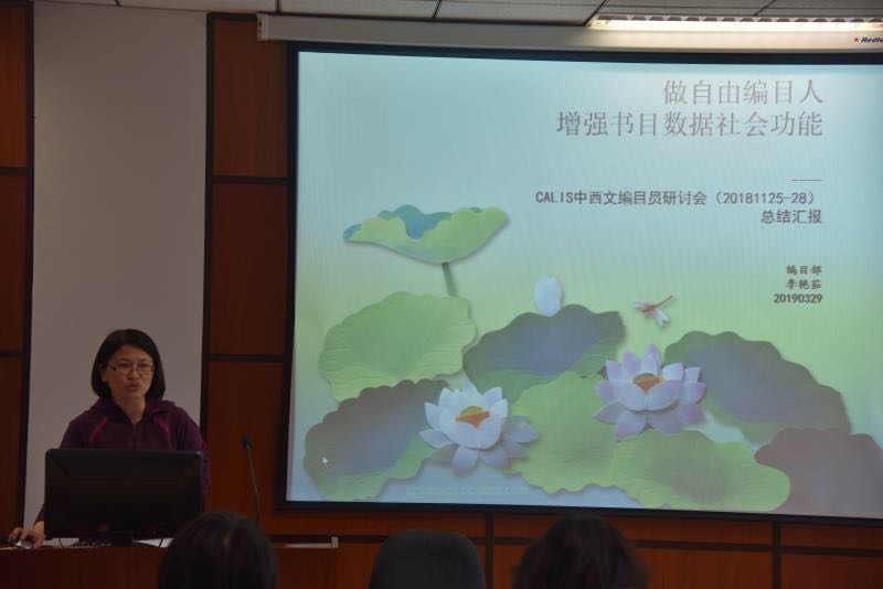 文献编目部李艳茹同志从业务交流角度,以“做自由编目人 增强书目数据社会功能”为主题介绍了她代表图书馆参加CALIS中西文编目员研讨会情况,以专业的角度,将培训会内容进行了加工、整合、传达,讲解条理清晰、专业性强、深入浅出、透彻到位。