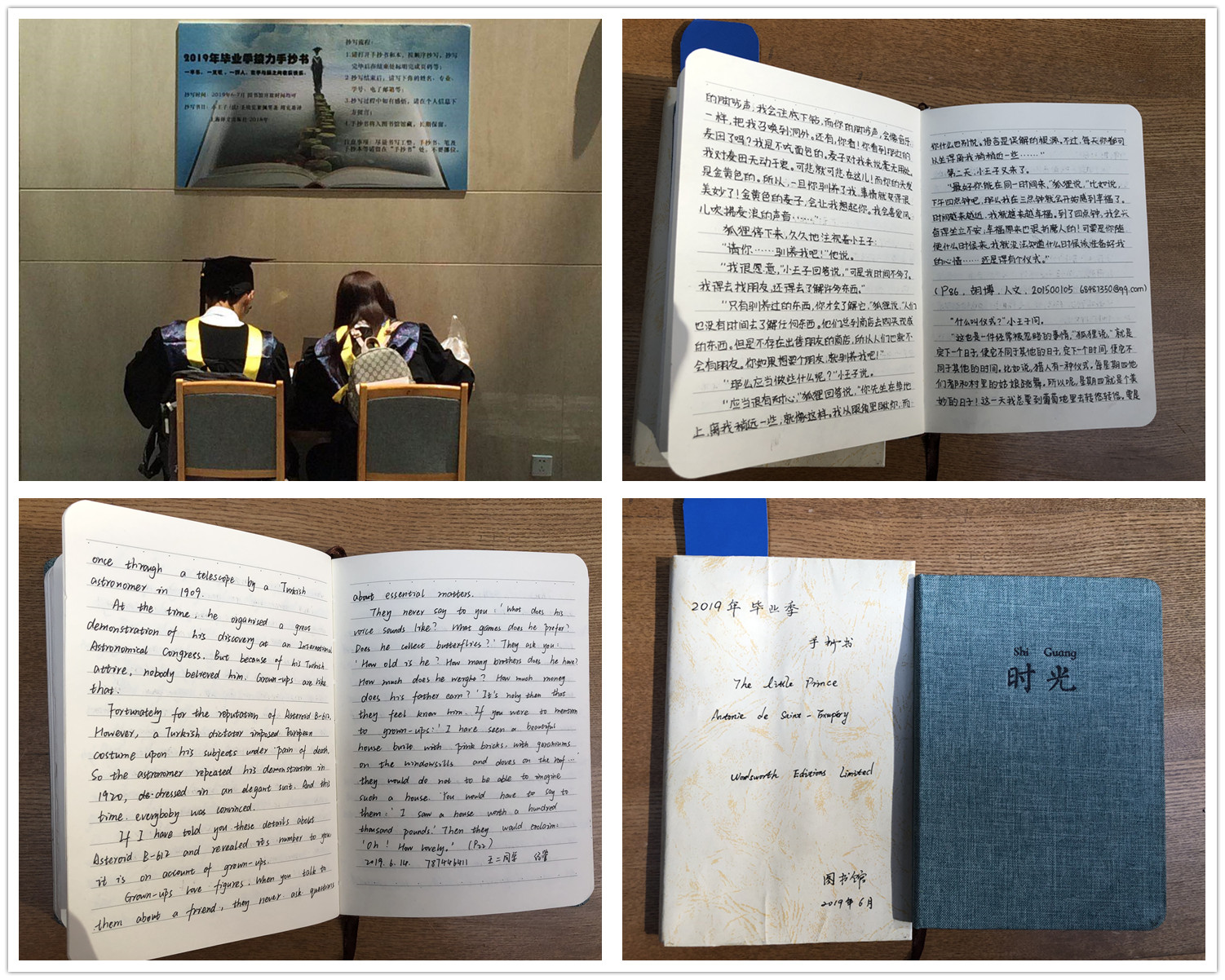 圕•书——接力手抄书。毕业季,图书馆开展了毕业生接力手抄《小王子》活动,活动一经发出,得到了毕业生的热情参与。历时23天,191名毕业生接力手抄完成了《小王子》中文版和英文版,并留下感悟和寄语:“所有的大人起先都是孩子,请一定保持颗童心,无论何时……” “就像小王子离开地球,我们即将离开大工,虽然我身离开你,但我心决不离开,我们后会有期”。这是图书馆送给2019届毕业生的第一份礼物,希望毕业生在未来的人生道路上能够永葆童心。同时,这也是毕业生留给图书馆和母校的珍贵礼物,《小王子》目前在全世界有150余种外国语言,400多个版本,但这本充满温暖和感动的“2019届毕业生接力手抄版”对大工图书馆来说却是最珍贵、最有意义的一个版本,图书馆将永久珍藏。