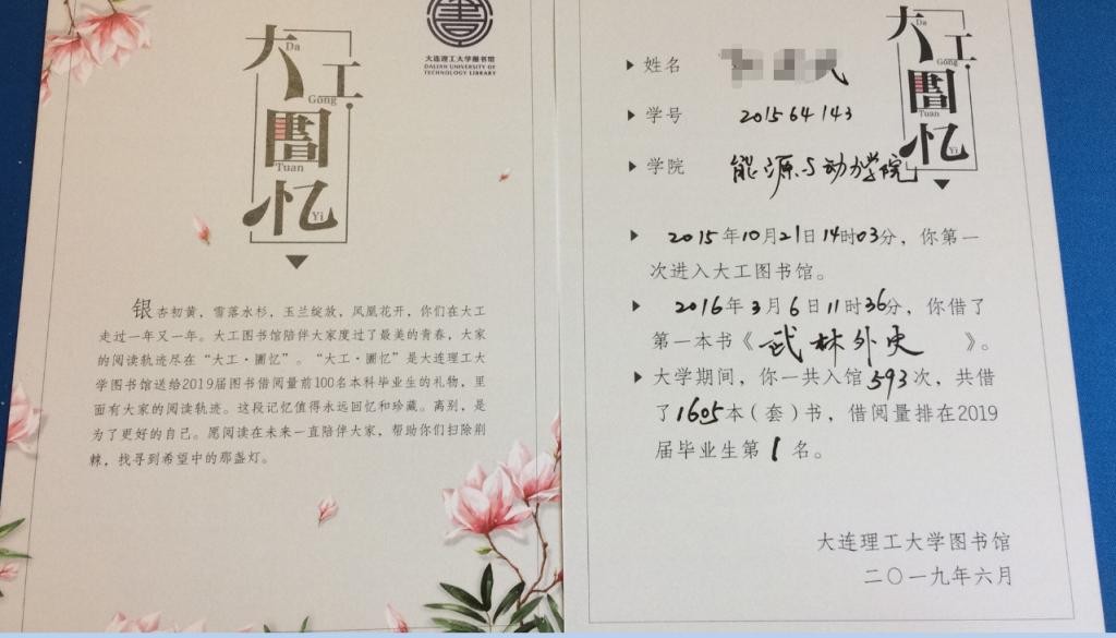 圕•忆——专属阅读轨迹。无论是闲暇阅读还是备战考试,在大工的日子里,图书馆一定是大工学子心中最深刻的印记之一。“大工•圕忆”是图书馆送给2019届图书借阅量前100名本科毕业生的特殊礼物,记录着读者第一次踏入图书馆是何年何月,几时几分,也记录着每一位读者的阅读轨迹。图书馆用这种方式为毕业生送上祝福,也以此激励在校学生多读书,书香为伴的记忆值得永远回忆和珍藏。