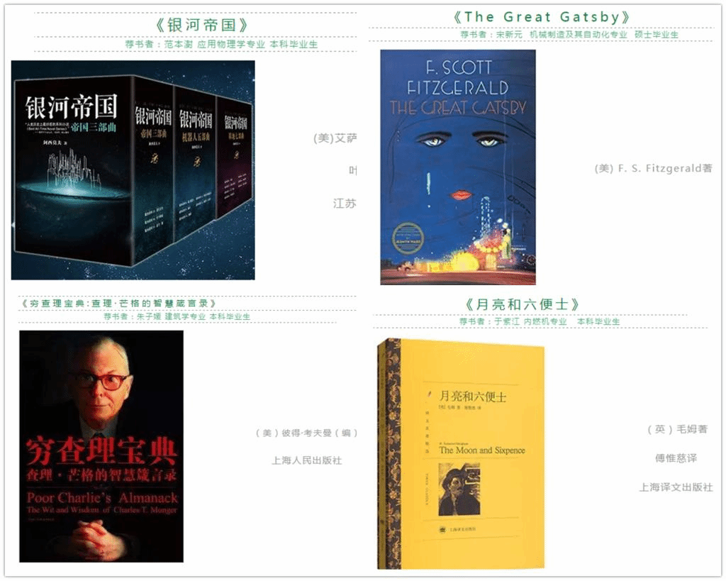 圕•荐——毕业生阅读书单。“毕业生阅读书单”活动共邀请9位毕业生向大家推荐对自己影响深刻的一本书。《了不起的盖茨比》、《银河帝国》、《穷查理宝典:查理 芒格的智慧箴言录》……不仅推荐的书目精彩,推荐理由也写的深刻、动人。《了不起的盖茨比》的推荐语中这样写道:“看到Jordan对Nike说‘I thought you were rather an honest, straightforward person. I thought it was your secret pride’,我哭了。希望所有的坚守都能有所收获。”毕业生阅读书单视为毕业生送给图书馆的礼物,图书馆已将书单发布,与全体读者共享这份礼物,将阅读进行到底。