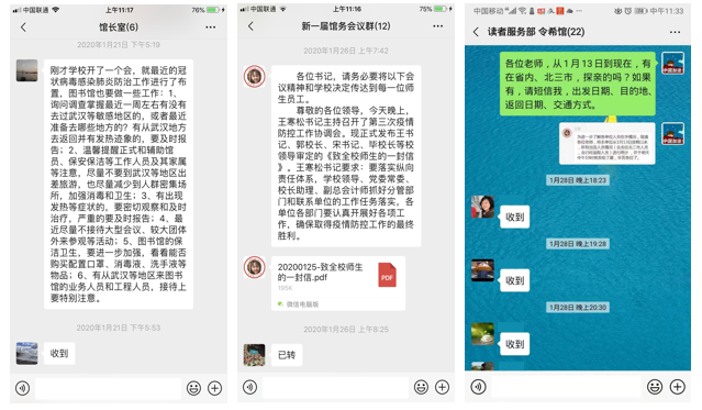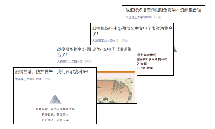 战“疫”期间,外地学生暂不返校,本地师生不宜到校,课程学习、课外阅读、论文撰写、基金申报、科研攻关,图书信息资源不可或缺,图书馆想师生之所需、解师生之所急,为宅家读者开展全方位的咨询支持和图情服务:推出“战疫修炼指南”系列咨询支持,数据库24小时在线服务,查收查引查新线上申请线上办理,学位论文网上提交,急需图书借阅线上预约馆员直送,文献传递、图书荐购和图书捐赠等特事特办,采取全新的机动灵活服务方式。全体馆员主动担当、共克时艰,“千方百计”满足师生对文献信息和咨询服务的急迫需求,特殊时期共同抗“疫”,助力师生教学科研工作“不断线”“不缺粮”。