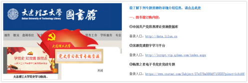 图书馆主页开辟了党史学习教育专题文献资源网页。梳理现有馆藏电子资源,汇总形成党史专题数据库资源,列表推送,便于检索下载。同时,从党史党建相关数据库资源中有针对性地选择了部分数据库平台,一并开通试用。